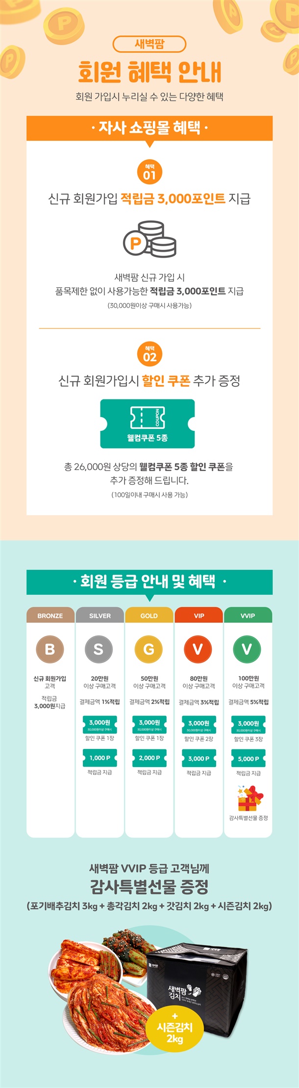 - 6개월간 총 구매 금액에 따라 해당 월1일 회원등급이 새롭게 적용되며, 쿠폰도 지급됩니다.